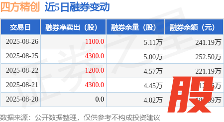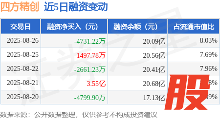 本站消息,8月26日,四方精创(300468)融资买入4.87亿元,融资偿还5.34亿元,融资净卖出4731.22万元,融资余额20.09亿元。